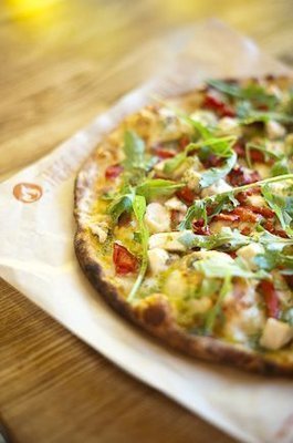 pesto drizzle over grilled chicken, roasted red peppers, chopped garlic, mozzarella, arugula